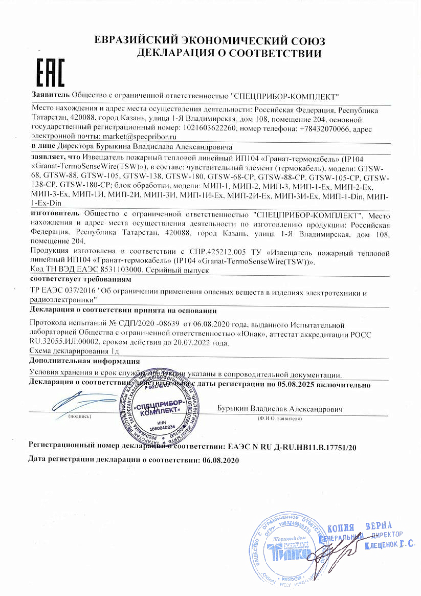 Служит для обнаружения превышения пороговой температуры как признака пожара по всей своей длине и предназначен для применения в системах пожарной сигнализации совместно с модулями «МИП»