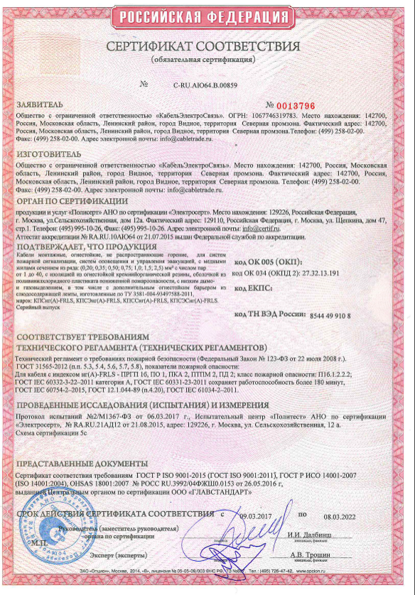 • Для одиночной и групповой прокладки в системах ОПС, СОУЭ, систе- мах безопасности и телекоммуникаций, которые должны сохранять работоспособность в условиях пожара.