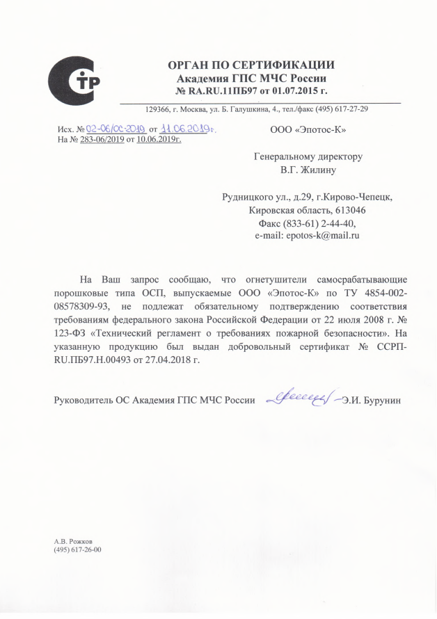 Самосрабатывающие огнетушители ОСП-1 включены в утвержденные указанием МПС России "Нормы оснащения объектов и подвижного состава федерального железнодорожного транспорта первичными средствами пожаротушения", разработаны и изданы "Методические указания по проектированию установок модульного порошкового пожаротушения для защиты специального подвижного состава", "Технические требования к противопожарной защите специального подвижного состава", в которые включены примеры расчета и обоснование выбора требуемого количества самосрабатывающих огнетушителей ОСП-1 для защиты специального подвижного состава. С 2000 года на всех постах контроля за температурой букс колесных пар железнодорожных вагонов внедряются системы противопожарной защиты.