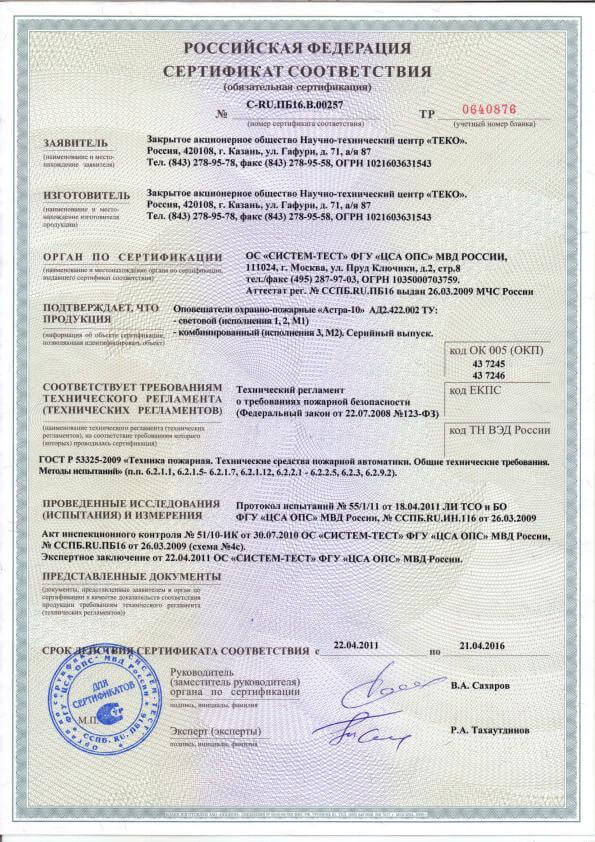 Сертификат соответствия Блок индикации Астра-863 исп.А Теко (лист 10)