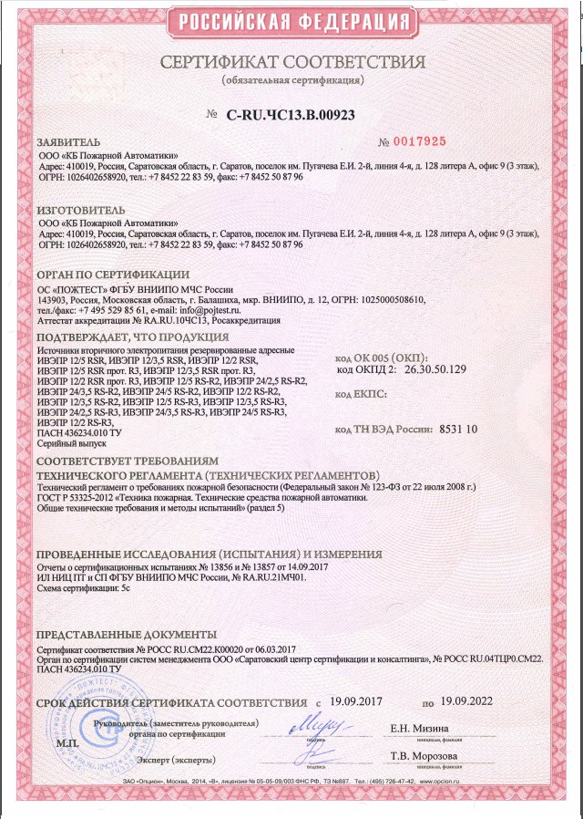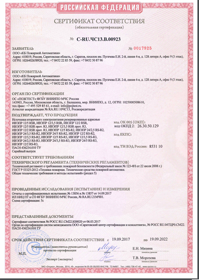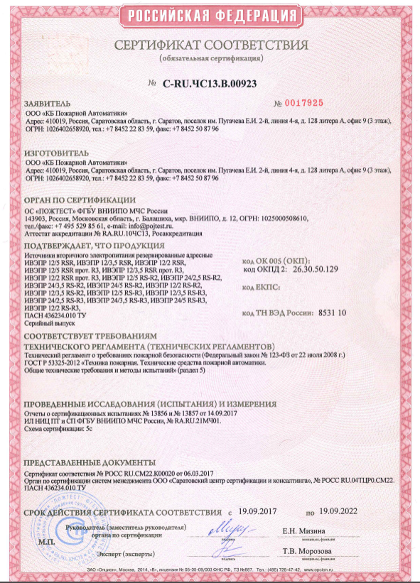 Источник питания номинальным постоянным напряжением 24 В и выходным током до 2,5 А. Предназначен для стабильного бесперебойного электропитания систем охранной и пожарной сигнализации, пожаротушения, дымоудаления и оповещения.